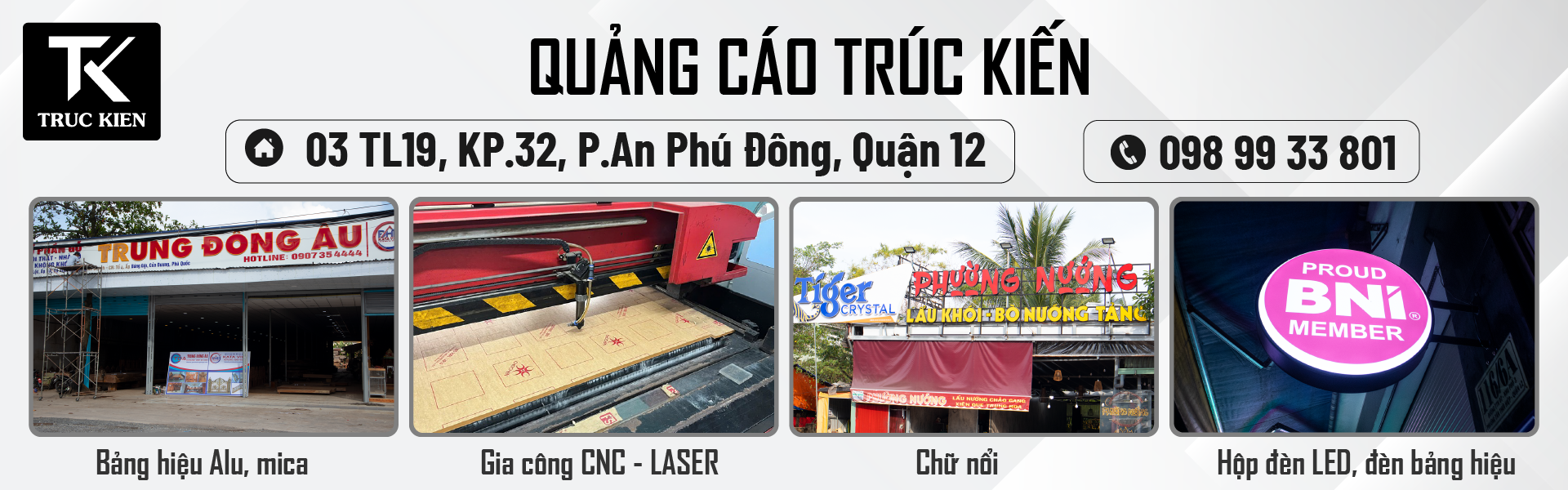 Quảng Cáo Trúc Kiến nhận thi công tất cả các loại bảng hiệu, biển led, bảng ma trận, màn hình led, biển chỉ dẫn, biển bảng văn phòng trên toàn miền Nam. Cam kết với chất lượng tốt nhất, uy tín và bảo hành lâu nhất.