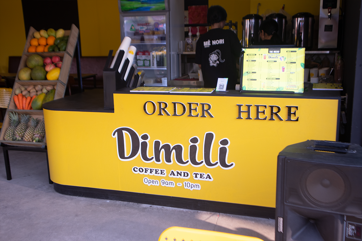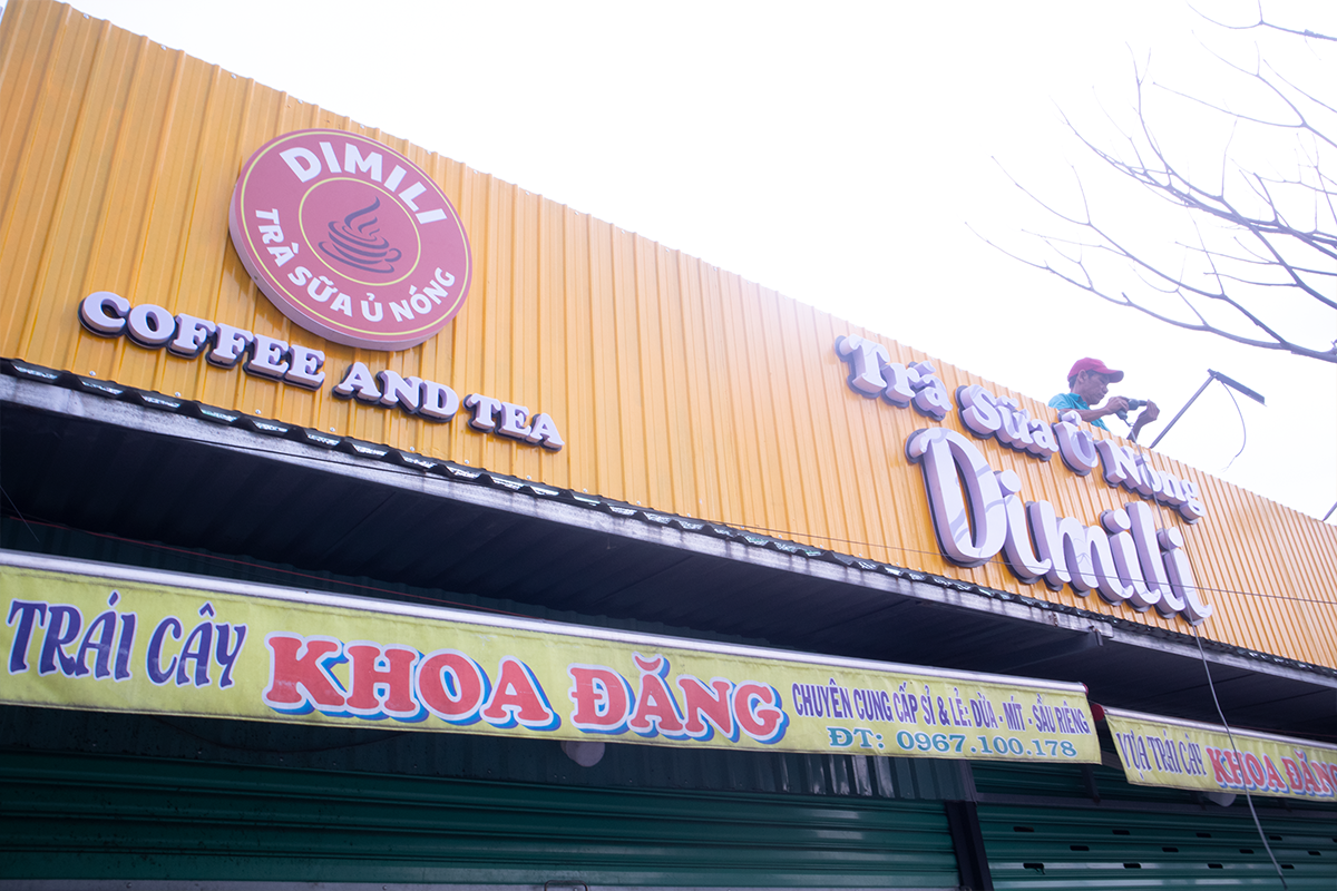 Dimili Coffee & Tea lựa chọn tone vàng nổi bật kết hợp chữ nổi mica viền đen sang trọng, tạo điểm nhấn mạnh mẽ giữa khu phố. Toàn bộ hạng mục được thi công trọn gói từ thiết kế đến gia công và lắp đặt hoàn thiện.